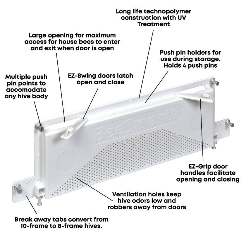 Includes pins to fit BeeSmart® IPM Bottom Board or act as bottom vent on conventional bottom boards